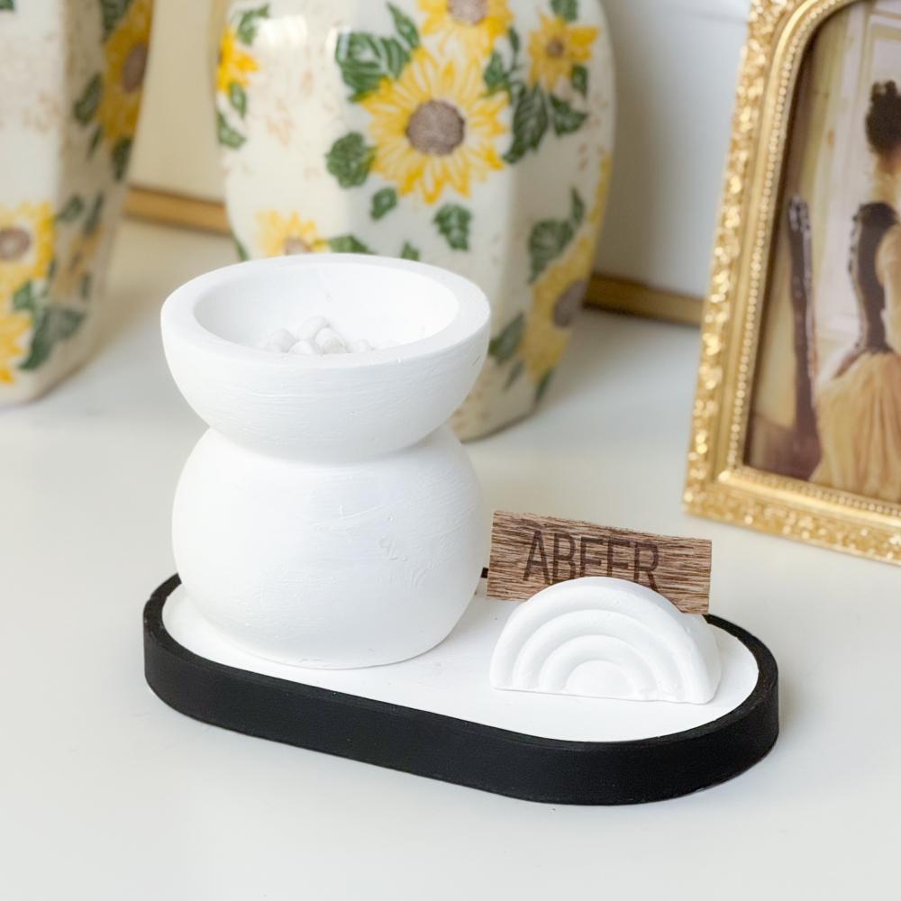 مبخرة بتصميم عصري بسيط باللون الأبيض مع قاعدة أنيقة باللون الأسود تعطي توازن رائع بين الرقي والحداثة. مناسبة لوضع البخور أو الفحم العطري، وتجي بشكل عملي وراقي يزين أي ركن في البيت أو المكتب.